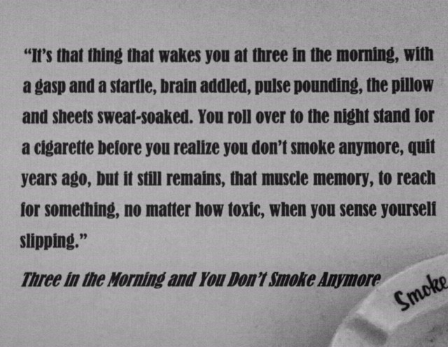 In the meantime, my chapbook, “Three in the Morning and You Don’t Smoke Anymore,” is out now and widely available, including at Amazon and Barnes & Noble. And if you already have it, and read it, and liked it, good reviews on Amazon or Goodreads are always appreciated!